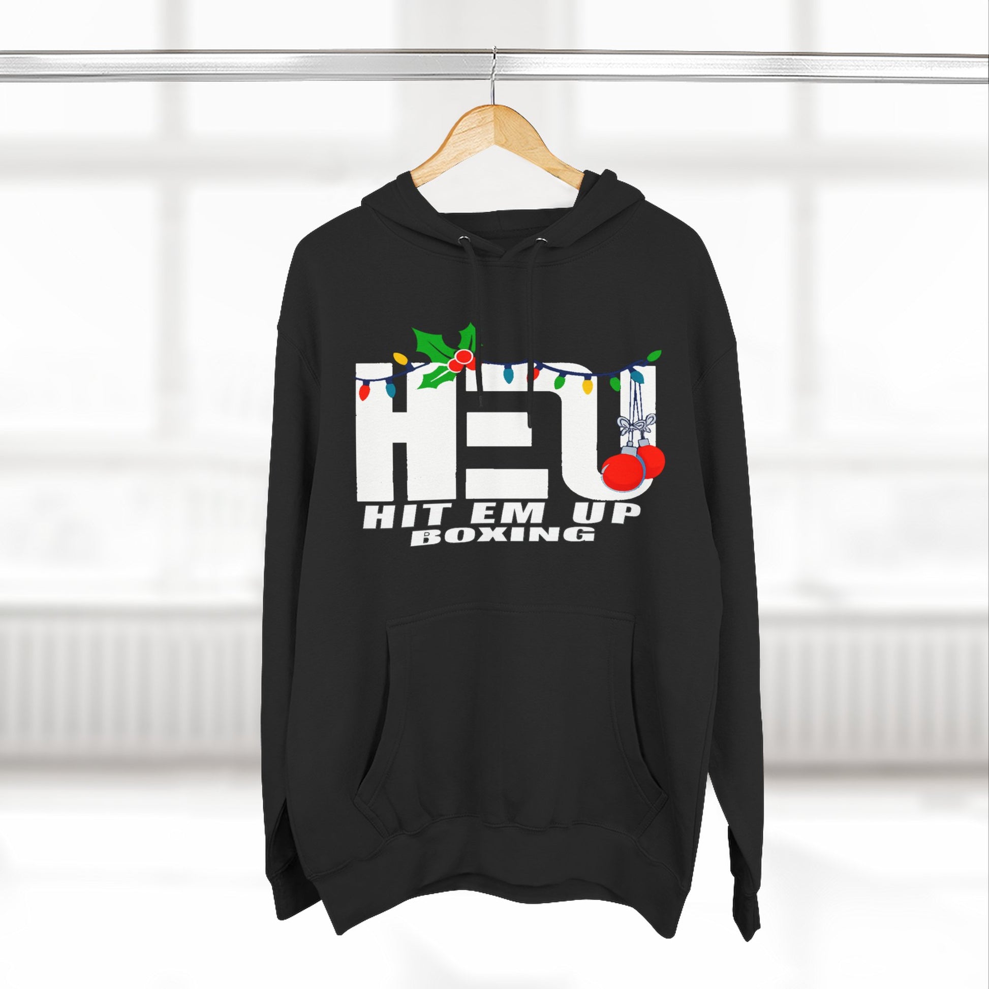 Throw on this medium-weight fleece hoodie and get ready to level up your comfort game. Whether you're warming up before training, lounging on lazy weekends, or just dodging the chill, this piece has your back. The spacious kangaroo pocket keeps your hands happy, while adjustable drawstrings with metal grommets lock in the cozy vibes. Soft 3-end fleece fabric hugs your body and shows off printed designs with crisp, bold detail—like our festive boxing logo that brings holiday spirit to your everyday grind. Reinforced seams and twill neck tape mean this hoodie laughs in the face of wash day, staying fresh and keeping its shape. Layer it, wear it solo, or rock it as your go-to athletic flex with a playful seasonal twist.